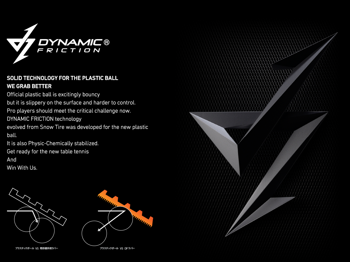 Do tính chất trơn nhẵn trên bề mặt trái bóng Plastic 40+ mới hiện nay và nhiều loại mặt vợt chưa thể hoàn toàn đáp ứng đượcviệc tạo xoáy và tốc độ bóng một cách tối ưuhoặc đã cố gắng tăng cường độ xoáykhi ma sát nhưng lại mất đi tốc độ hoặc kiểm soát với trái bóng trong trận đấu ,thìngay lập tức công nghệ DYNAMIC FRICTION đã giải quyết một cách hoàn hảo việc đó tăngcường ma sát động, tốc độ phát huy và dễ điều khiển nhất hướng đến mọi đối tượng người chơi.